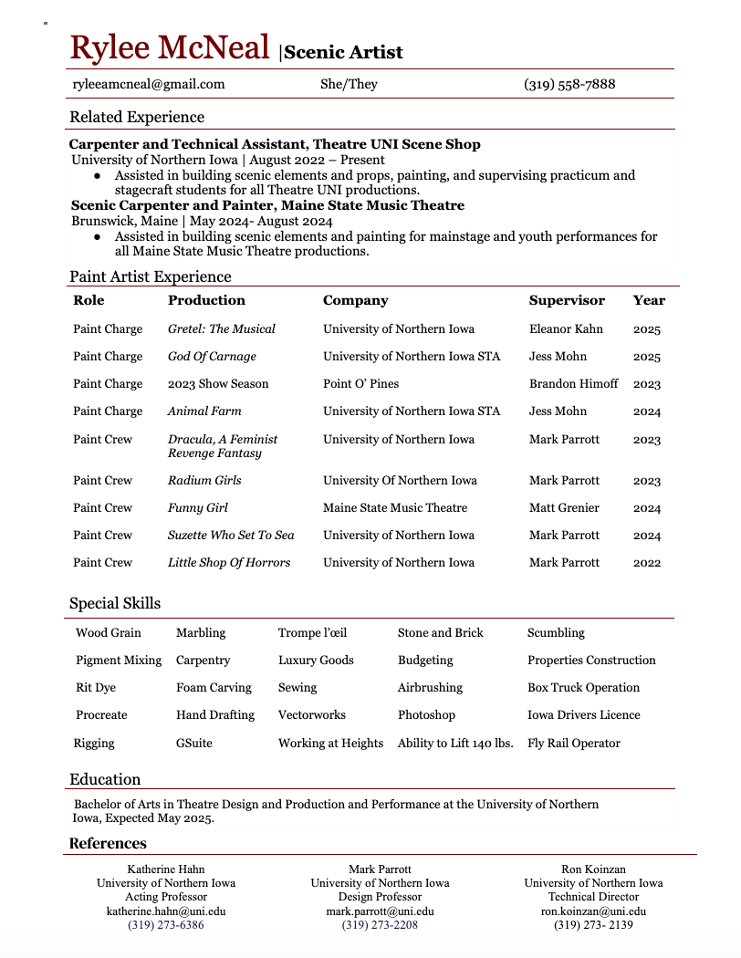 Hello! Welcome to my scenic artist page! I have been scenic painting for five years and have found joy in creating worlds for actors to live in while on stage. Over the past five years, I have gained a variety of techniques, including woodgrain, marbling, stone, and more.